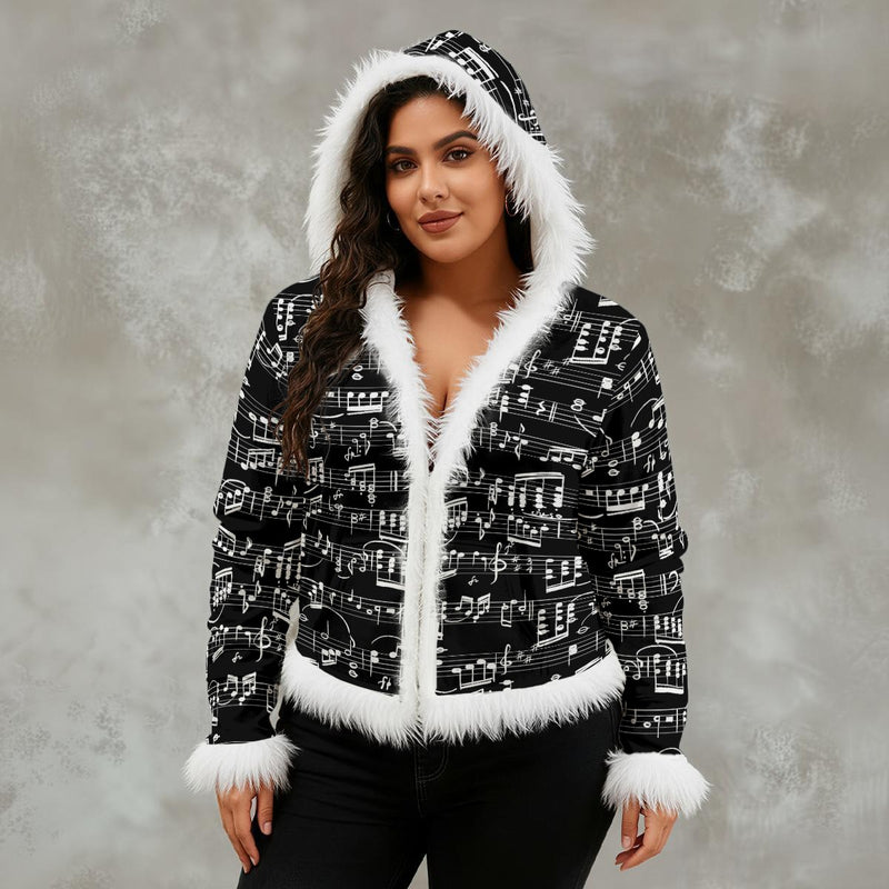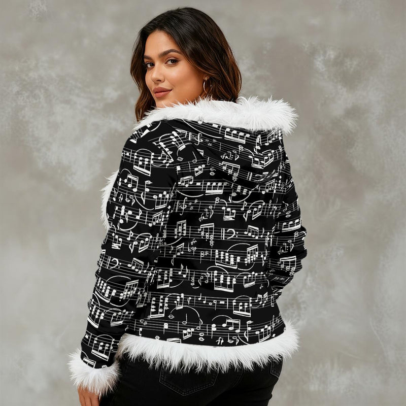 Music Scores Black Women's Faux Fur Trim Hooded Jacket