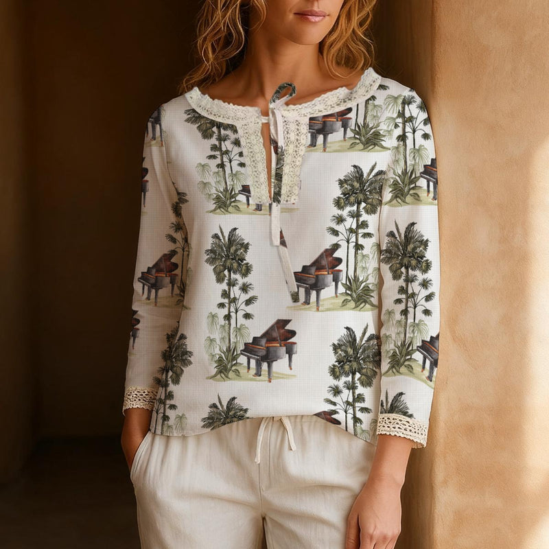 Woven from lightweight linen-look fabric, it keeps you feeling fresh while showcasing a whimsical grand piano design inspired by nature. Delicate lace detailing at the neckline and cuffs brings authentic boho flair, and the tie neck offers versatile styling options.