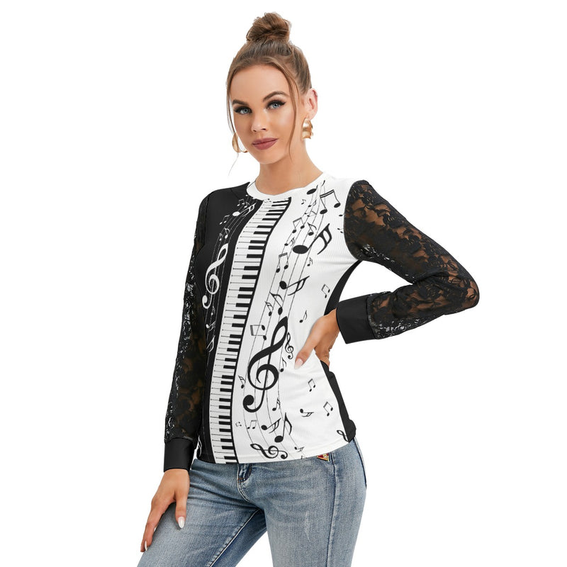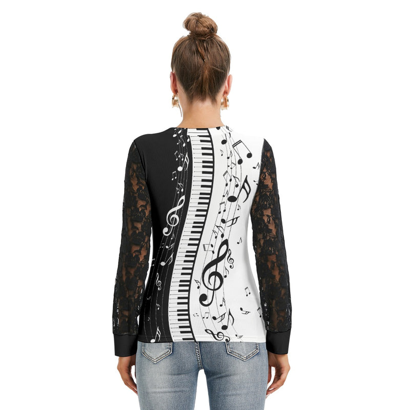 Elevate your everyday style with this striking Piano Print Lace Sleeve Top, where artistic flair meets wearable comfort. The sophisticated black and white palette features an intricate blend of music notes and piano keys, celebrating your love for music in understated elegance.