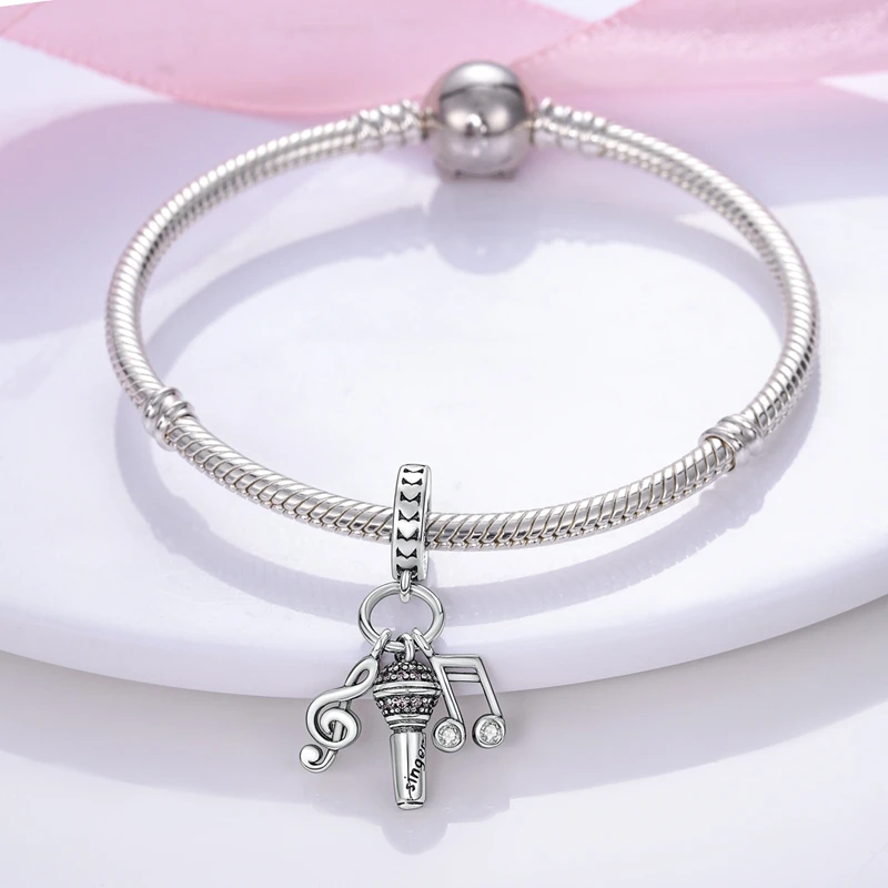 The guitar and microphone pendants are each about 1 inch long, and the charm comes in two styles: a guitar and a heart pendant engraved with music quote, or a microphone with 2 music notes pendants.