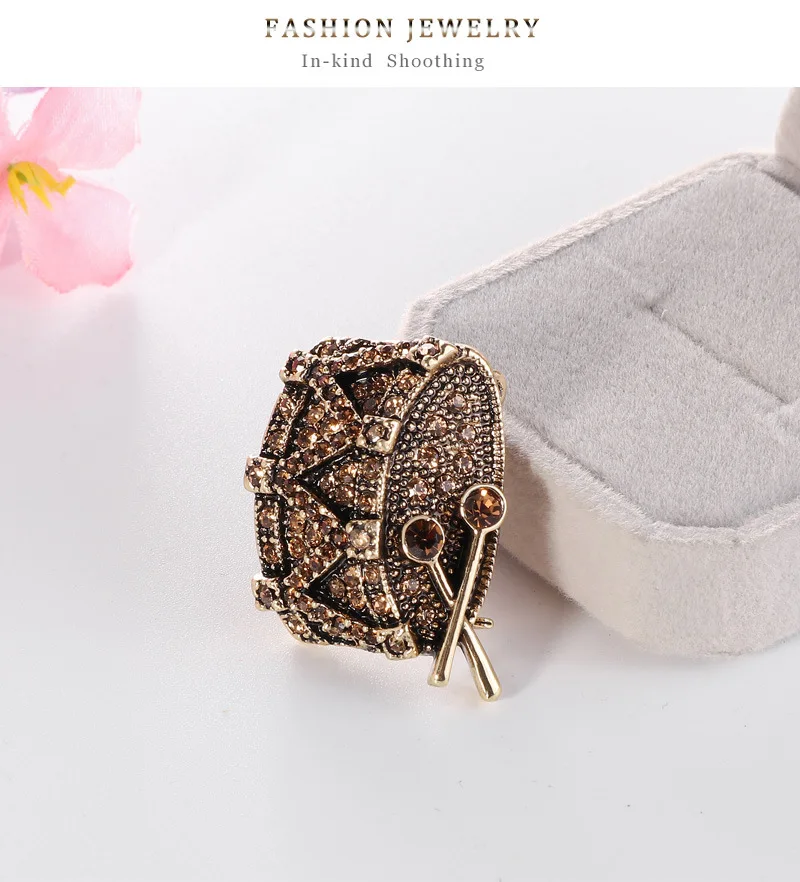 Ready to make some noise? Our Snare Drum Brooch lets you do just that - with added bling! This shimmering piece features sparkling rhinestones that will give your outfit the drama it deserves. Don't forget to tune up your wardrobe with this sparkling brown brooch and rock the night away. Bang a gong!