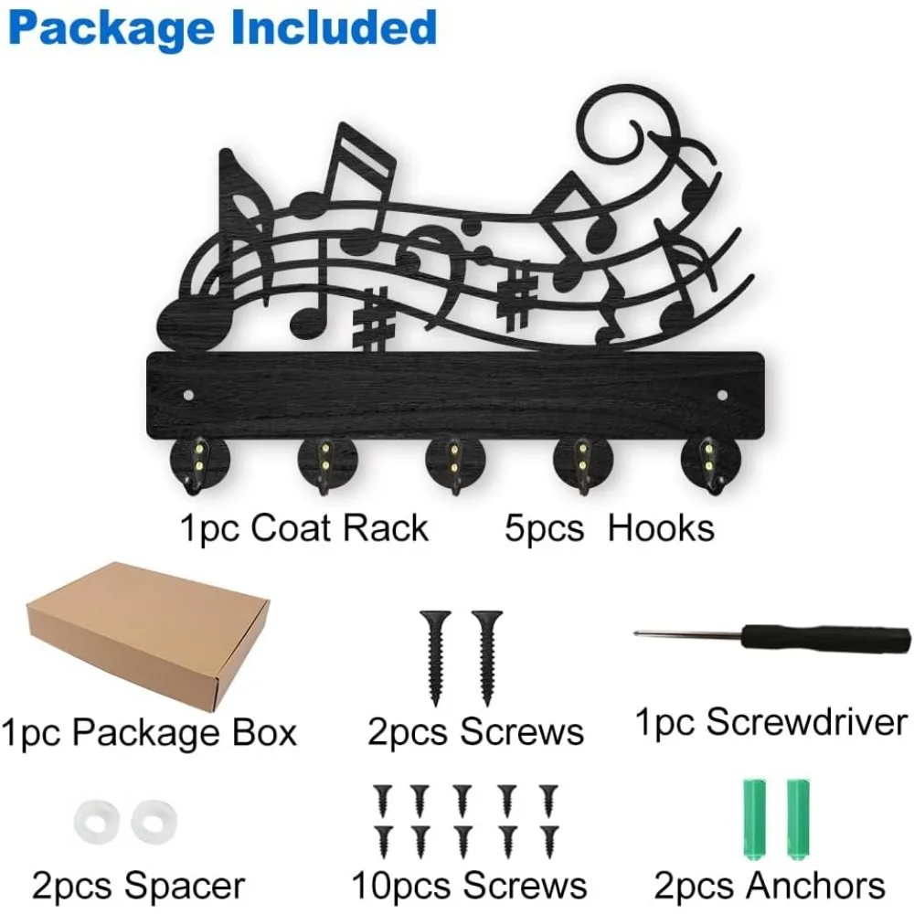 Design: This Music Scores Wood Hook Wall Hanger measures 11.8×7.9 inches and has five hooks spaced 2.4 inches apart. It comes with two mounting holes for easy installation.