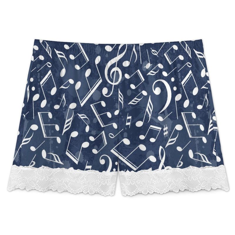 Sleep in style with these charming pajama shorts featuring a dark blue base adorned with white music notes that dance across the fabric. Soft lace trim adds a touch of sophistication to the playful design, making bedtime feel like a mini celebration.