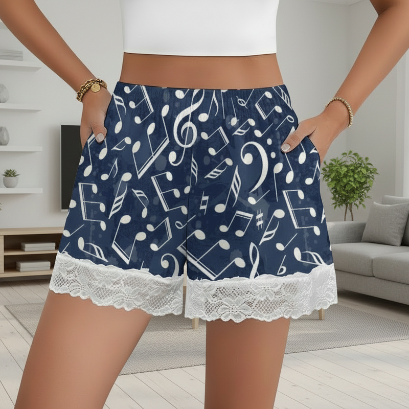Design: All-over music-inspired print with an elastic waistband and two pockets. Delicate lace trim adds style to these versatile shorts—perfect for lounging, yoga, beach days, or casual outings.