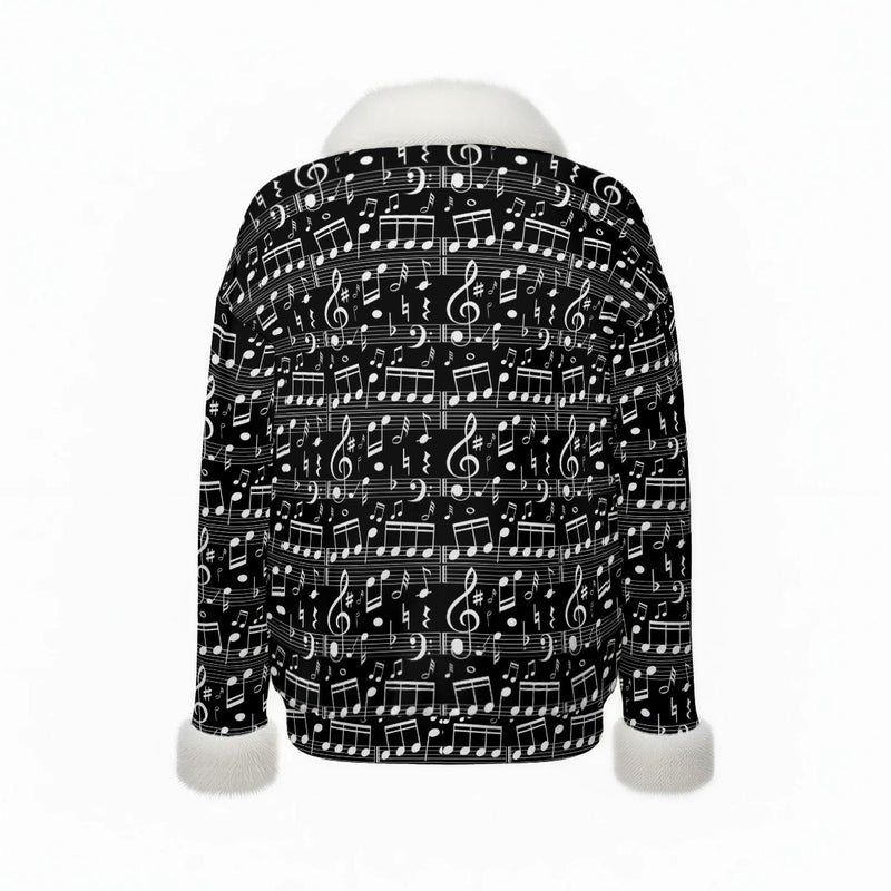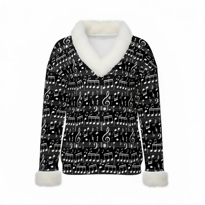 Celebrate the season in musical style with this enchanting Music Black Faux Fur V-Neck Sweater! Crafted from sumptuous soft polyester, it features an elegant white music scores pattern dancing across the black fabric.