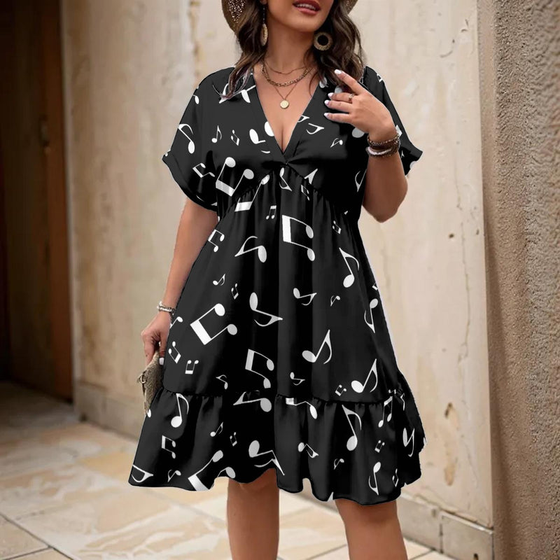 Featuring a flattering v-neckline and breathable short sleeves, it's perfect for warm days and casual outings. The playful musical note print adds a touch of artistic flair that speaks to your passion for music and creative expression. Crafted for comfort and versatility, this dress pairs effortlessly with sneakers for a laid-back vibe or dresses up with accessories for a night out.